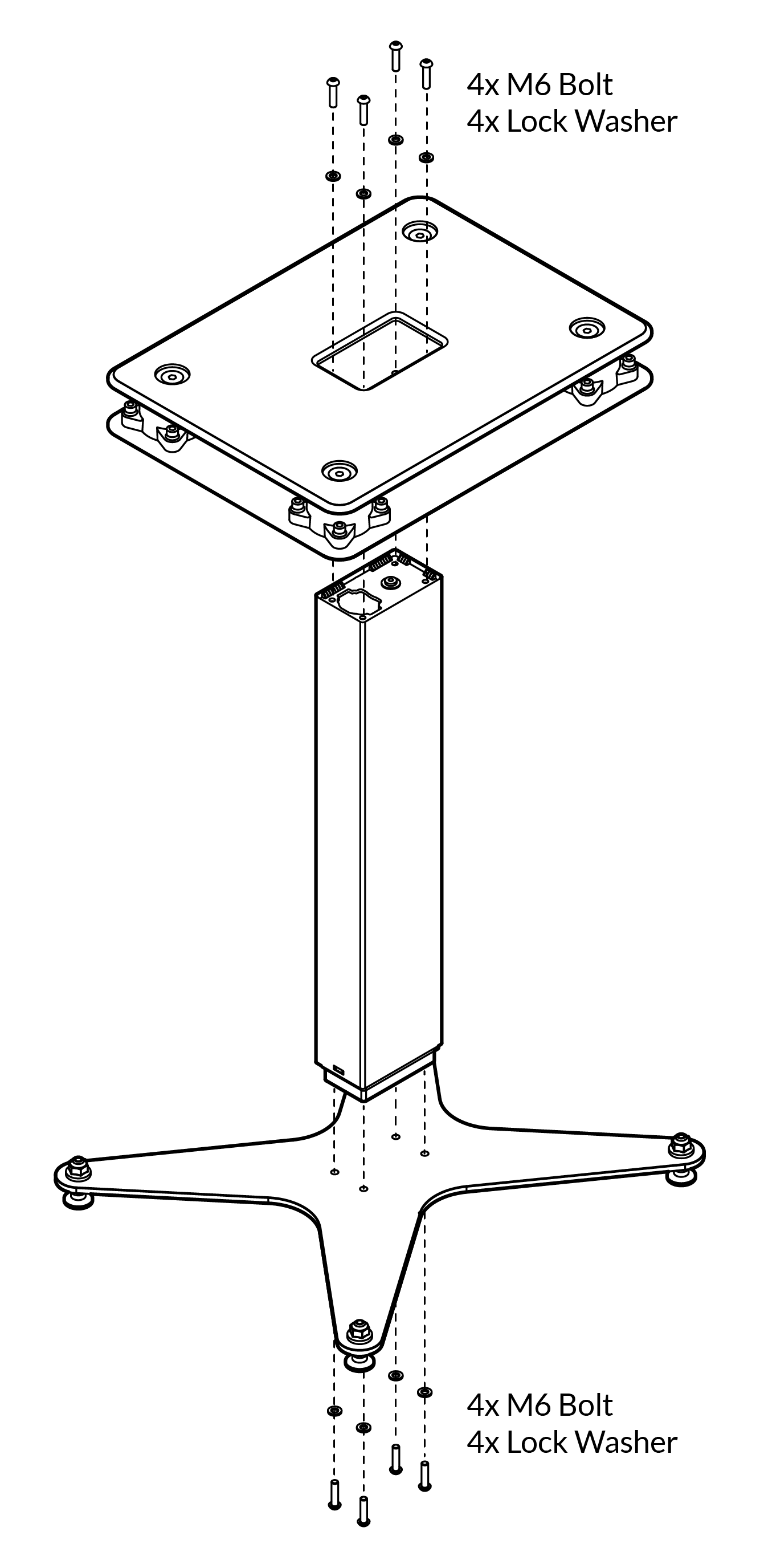 Step 3. Attach the assembled base plate to the bottom of the column using (4) M6 bolts through (4) M6 lock washers per stand. Use your fingers to thread the bolts, taking care not to cross thread any of the fasteners. Once all four bolts are fully threaded, tighten them with the supplied T-Handle Hex driver. Do not over tighten as this could damage the threads inside the column and void the warranty (max torque 10Nm).